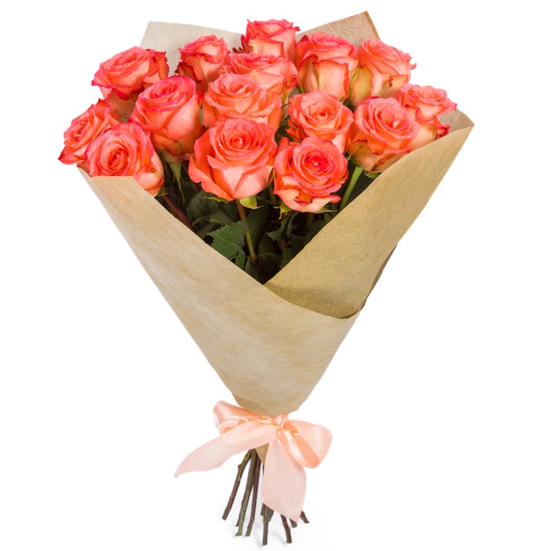 Букет состоит из 15 коралловых роз, крафт, атласная лента.