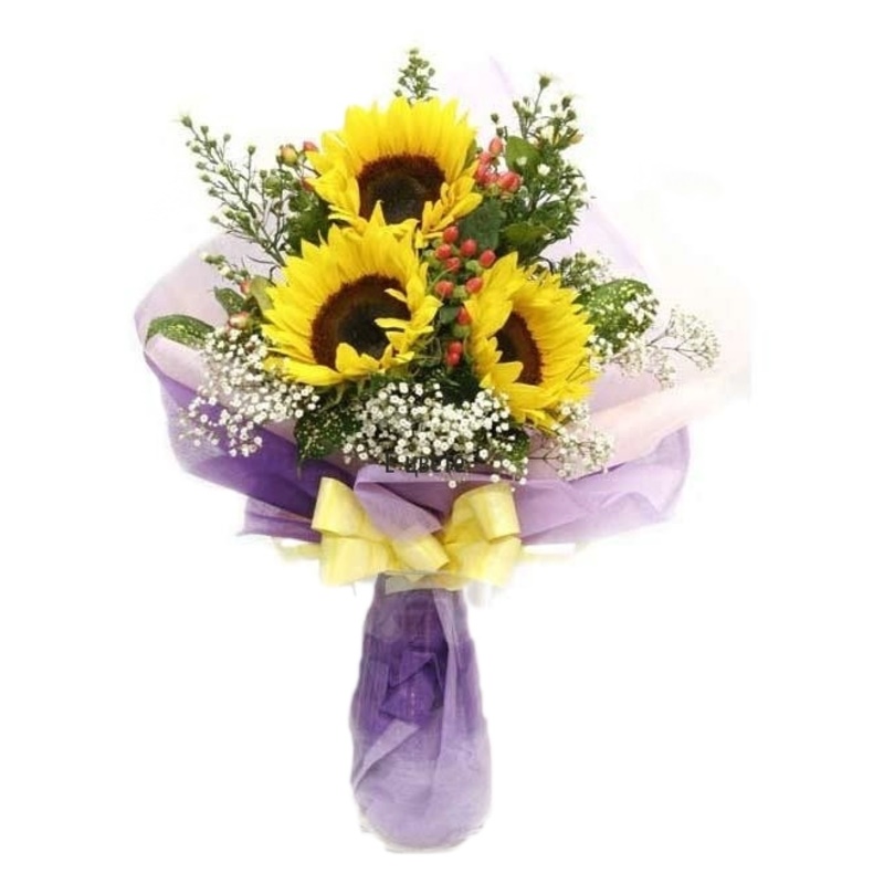 Букет состоит из 3 подсолнуха, 3 гиперикум, 3 гипсофила, зелень, красивая упаковка, атласная лента.