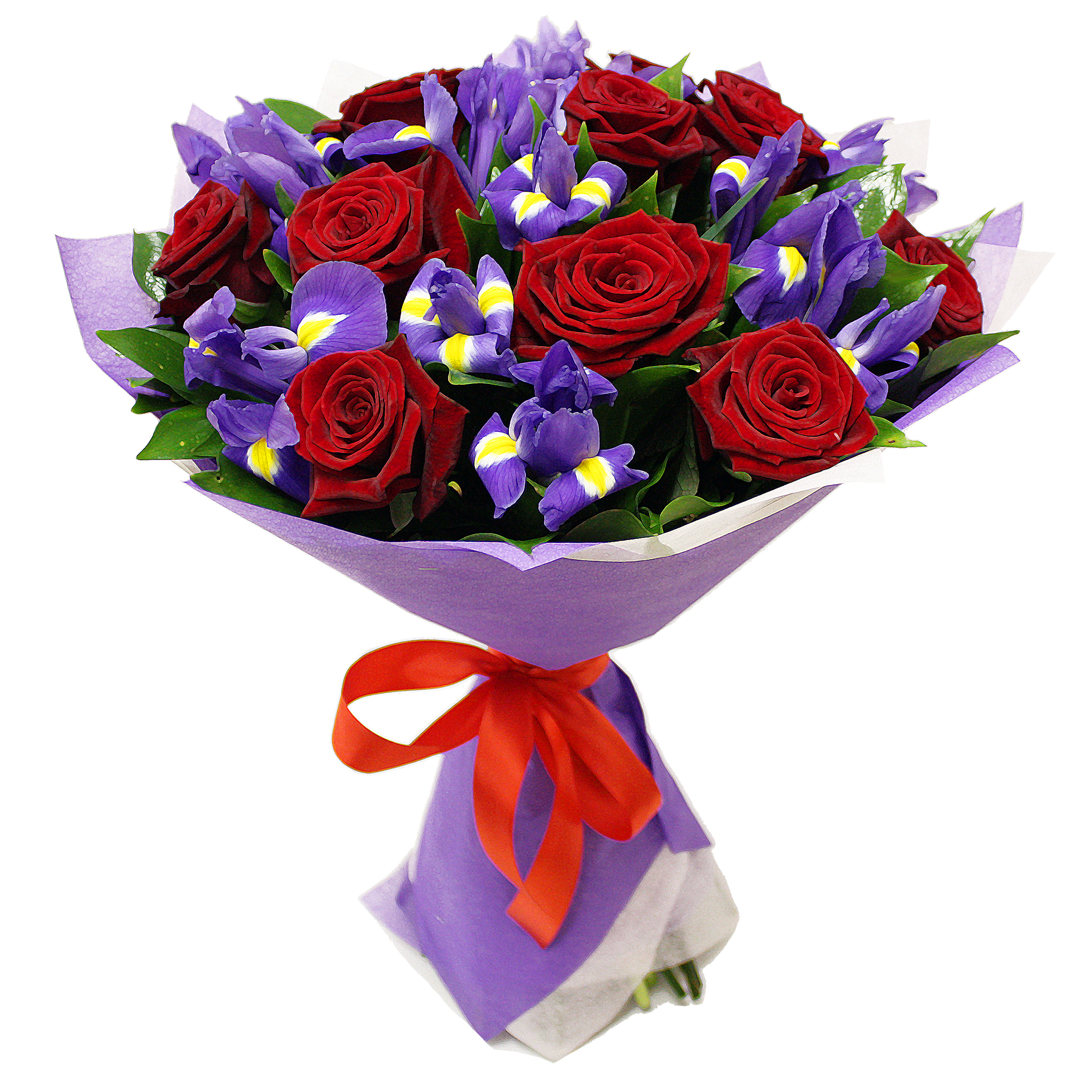 Букет состоит из 9 бордовых роз, 12 ирисов, зелень, красивая упаковка.