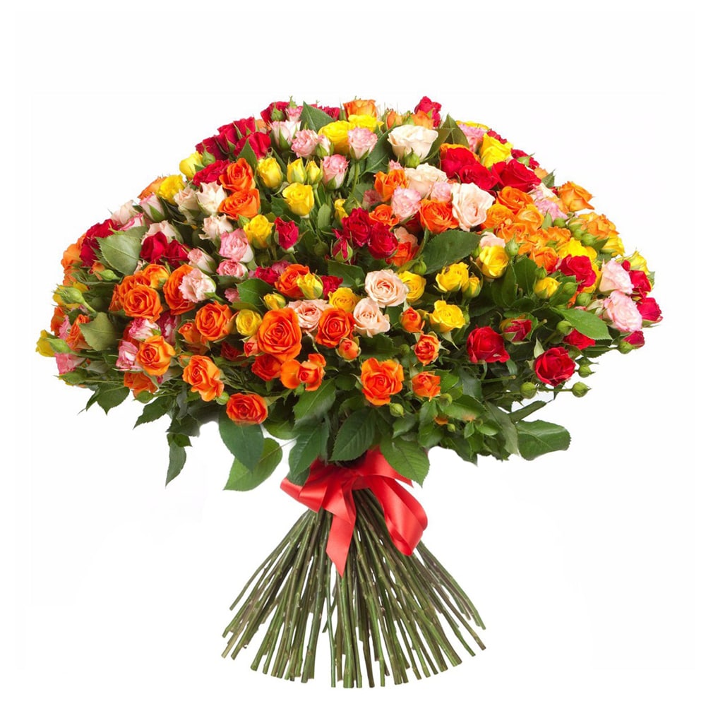 Букет состоит из MIX из 121 кустовой розы, прозрачная упаковка, атласная лента.