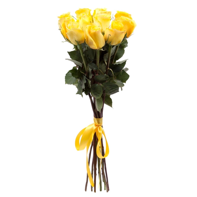 Букет состоит из 7 желтых роз, прозрачная упаковка, атласная лента.